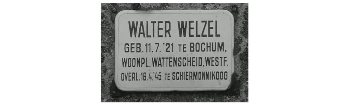 Grave 112. On 5 July 1945, 2 months after VE-day (Victory in Europe Day May 8, 1945) Dutch resistance patrolled the beach and found near pole 16 a washed up body in very decomposed state. Died at least 6 weeks before. The resistance men were T. van Dijk and carpenter Leo van Veen. The corps had on a blue striped sporting shirt, brown shoes and a brown leather belt around the waist. In the low brown shoes was written 1941-5-9. No other ID or markings on the body. This man was buried in grave 112. This could have been next to Walter Welzel in grave 111, but is was done on a more prominent position on plot 1 left side of the entrance. Maybe based on the shoes on the grave marker came: "An Airman", without rank, without RAF or date.