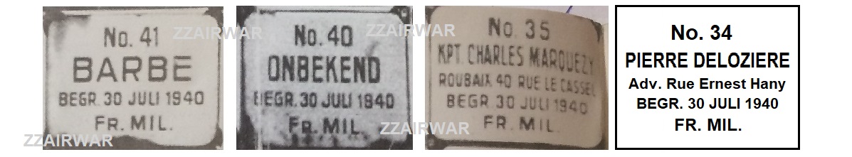 Grave 34. Pierre Deloziere. Also a Captain, but not recognized as an officer. They had found on him part of an address. Capitaine Pierre René Edouard Delozière, born in Boulogne-sur-Mer. Known 'died in sinking of a ship'. Buried here until 1949, reburied in France.