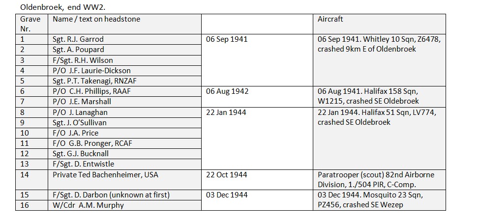 During WW2 four aircraft crashed east of Oldebroek. Their crews were the first airmen buried in this village, 15 men in total. One American paratrooper, scout Ted Bachenheimer of the 504 PIR (82nd Airborne Division) was also initially buried here (grave 14). Read more on this below.