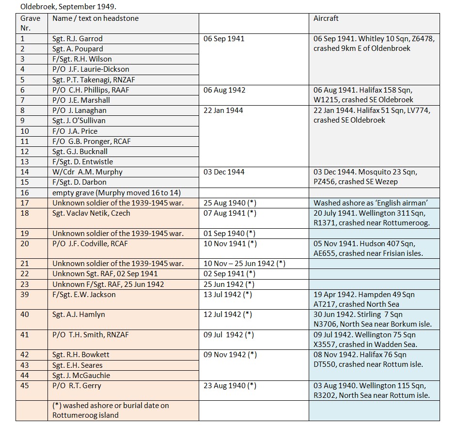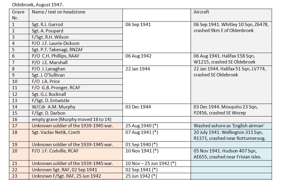 The above table shows the 29 men that lay in Oldebroek today, incl. their present grave numbers. The men are no longer buried in the above order. In the construction of the Pelouse d'Honneur some were moved again, possibly also for identification purposes, but they did not received a new grave number. For example Wing Commander Murphy and his navigator Darbon lay now between the men from Rottumeroog island. For a more information on W/C "Sticky" Murphy and a visit of his daughter in 2011 click here: http://www.oldebroek.net/phpBB2/viewtopic.php?p=14619#p14619
