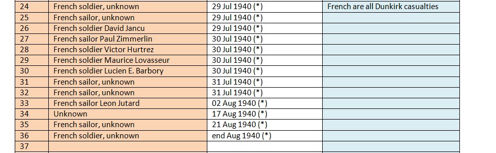 In grave 38 was resting R. Lambert (see above). This person was identified as British RAF Sgt. Raymond Lambert (1525044) on 11 January 1946 on Rottumeroog Island. Apparently this ID proved to be wrong, since his grave is no longer here and he is declared missing in action. Presumably this person was French or American and moved from Oldebroek to another cemetery. Lambert was no Dunkirk victim since his was ashore date was 10th of April 1943. He crashed in the Wadden Sea, north-west North Sea or north off the Frisians Islands probably in January - March 1943. Lambert could have been also his first or middle name.