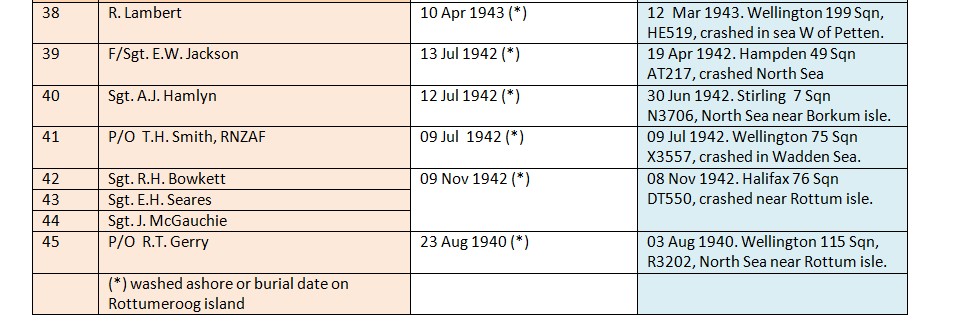 Because of the equal washing ashore location on Rottumeroog and the time frame, there is a connection between P/O Gerry and the unknown men in grave 17 and 19, see above table. The same between Sgt. Netik and grave 22. See for this also our file on Rottumeroog cemetery.