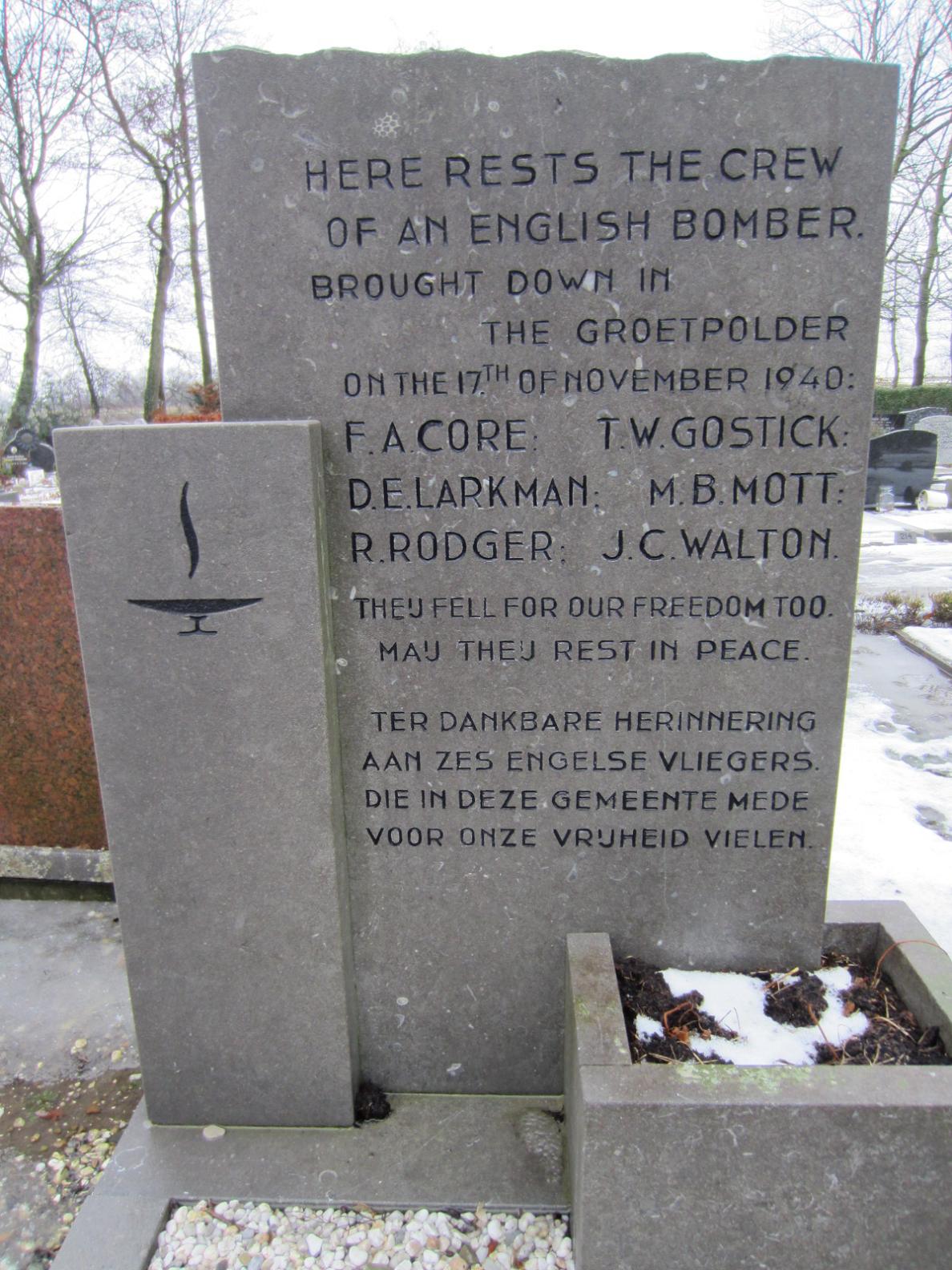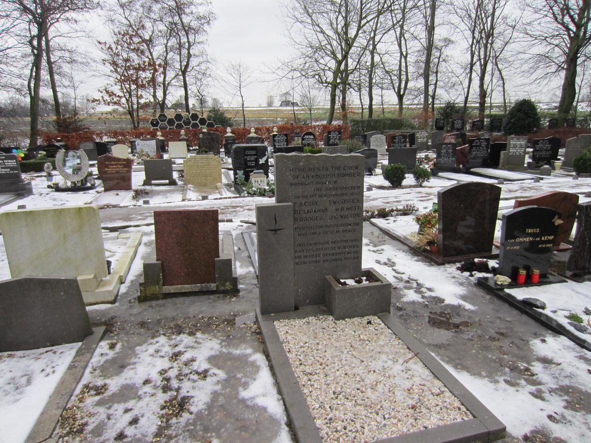 Small cemetery in the North. Rare in the way that the local monument from 1940 is still here and not replaced by the standard CWGC headstones. The crew of Wellington R9286 of 115 Sqn was buried here with all honours after a night-crash in a field nearby. The engraver of the stone had not enough knowledge of the English language (as most people in those days). He phonetically heard the text and chose in stead of 'Y' the Dutch letter combination i + j in 'MAIJ THEIJ REST IN PEACE' on the stone. It even looks ecclesiastical and more solemn. Below on the stone is engraved: "In grateful memory of the six English airmen that fell in our community for our freedom".