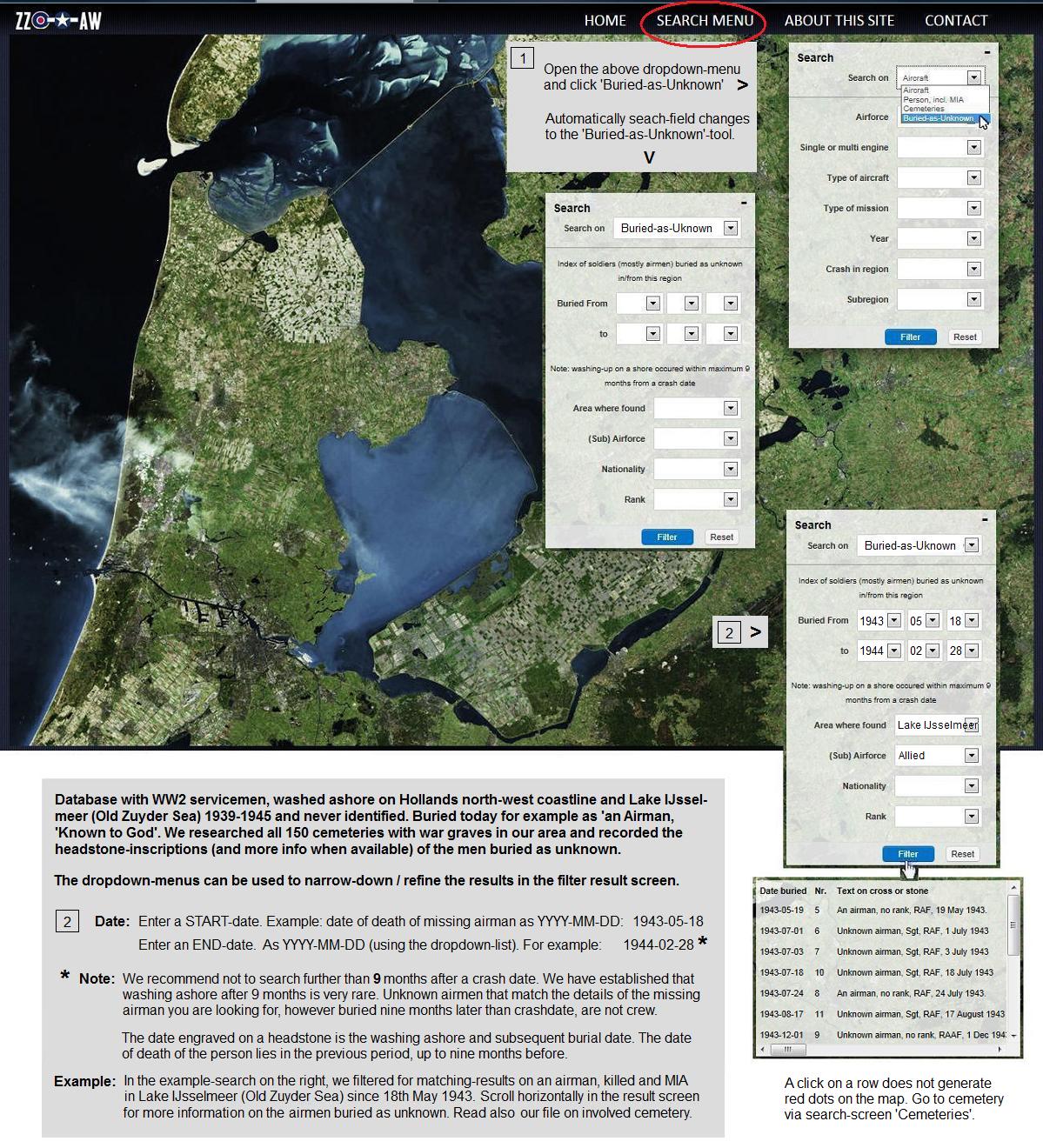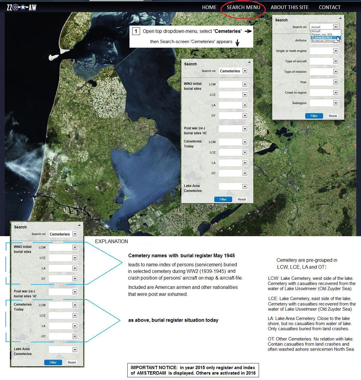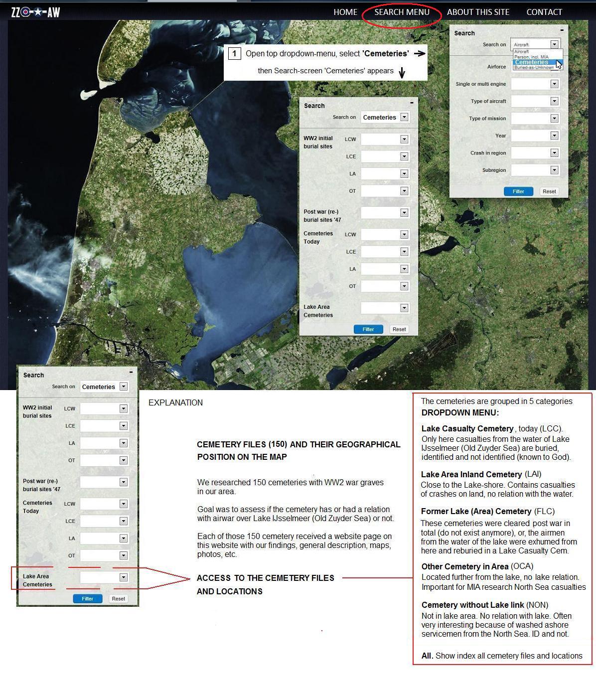 with help of dropdown menus + filter button, the most relative cemeteries to the airwar over the lake can be viewed.