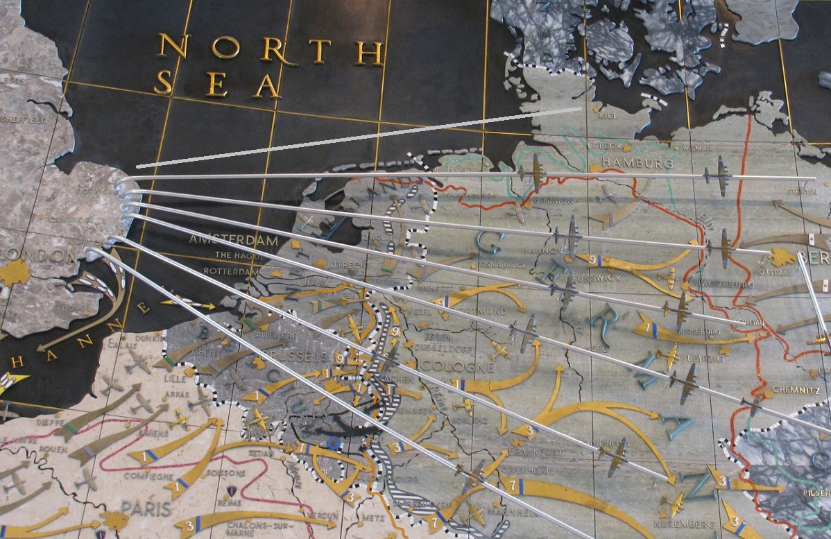 The English RAF (with also Commonwealth, Polish, Czech and Dutch crews) and from 1943 on the American 8th Air Force, took off from bases in East-England, crossing the coast between Yorkshire and Ipswich in Norfolk. Targets that led to many sea crashes with men MIA were German war industry and ports in northern cities as Emden, Bremerhaven, Wilhelmshaven, Bremen-Vegesack, Hamburg, Kiel, Peenemunde, Hamm, Münster/Osnabrück, Hannover, Brunswick (= Braunschweig), Halberstadt/Oschersleben, Magdeburg and Berlin. And of course the Ruhr Vally with Duisburg, Essen, Gelsenkirchen, Bochum and Dortmund.